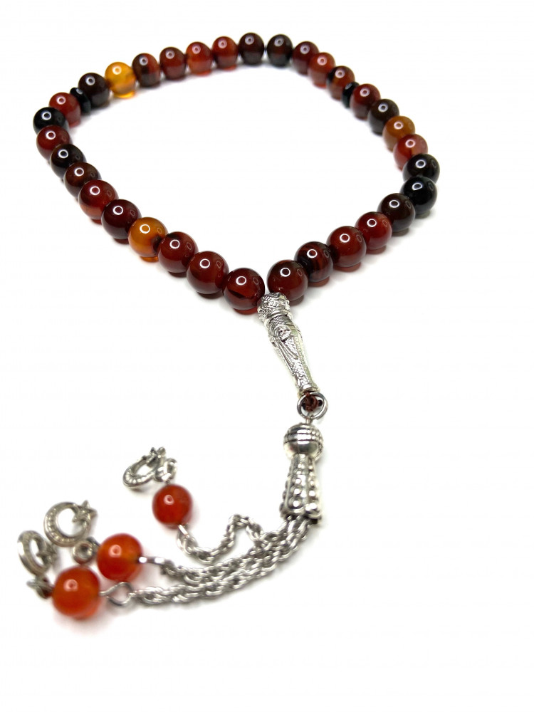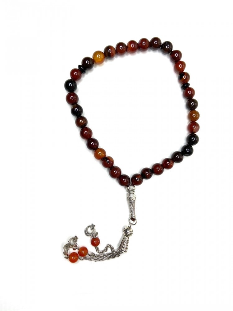 سبحة من خامة فاخرة من العقيق ذات ملمس حريري. تتميز هذه السبحة بلونها البني مقطع الخرز دائري متجانس و تزينها كركوشة تمليكة مشغولة بالنحاس مطلي ذهب.