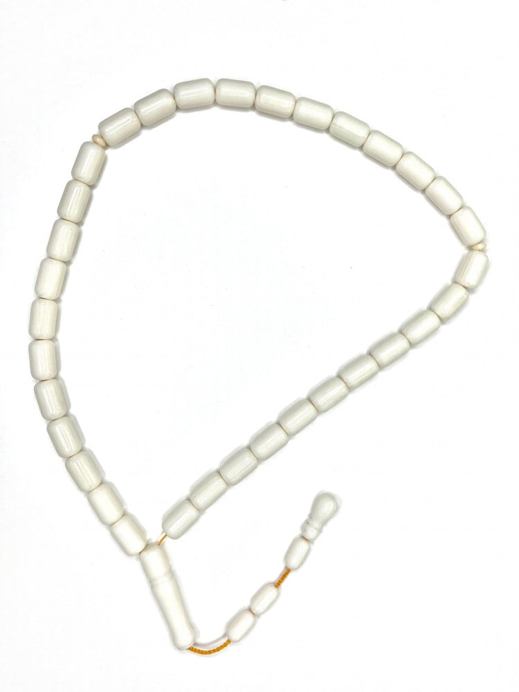 سبحة ناعمة و مميزة من العظم . تقطيع الخرز كبسولي متجانس و مشغولة يدويا بكل دقة و حرفية و تزينها كركوشة تمليكة مزينة حجر من نفس حجر السبحة.